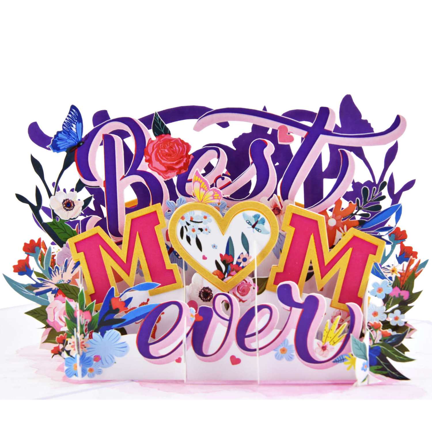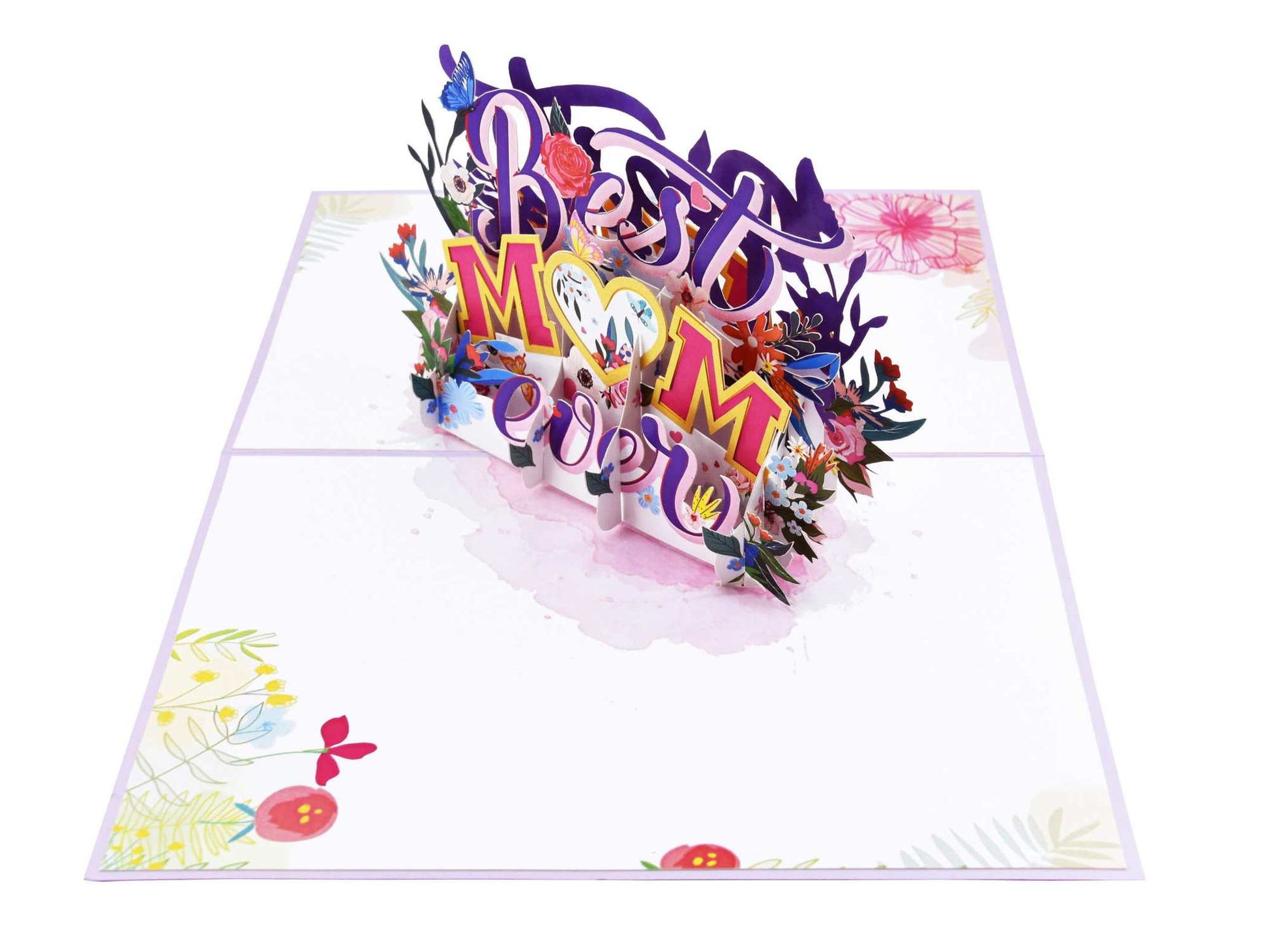 Show moms the appreciation they deserve and enlighten their day with this heart-warming pop up card. The pop-up says "Best Mom Ever" accented with heart, flowers and butterfly. It is a beautiful card to celebrate mother's birthday, Mother's Day.