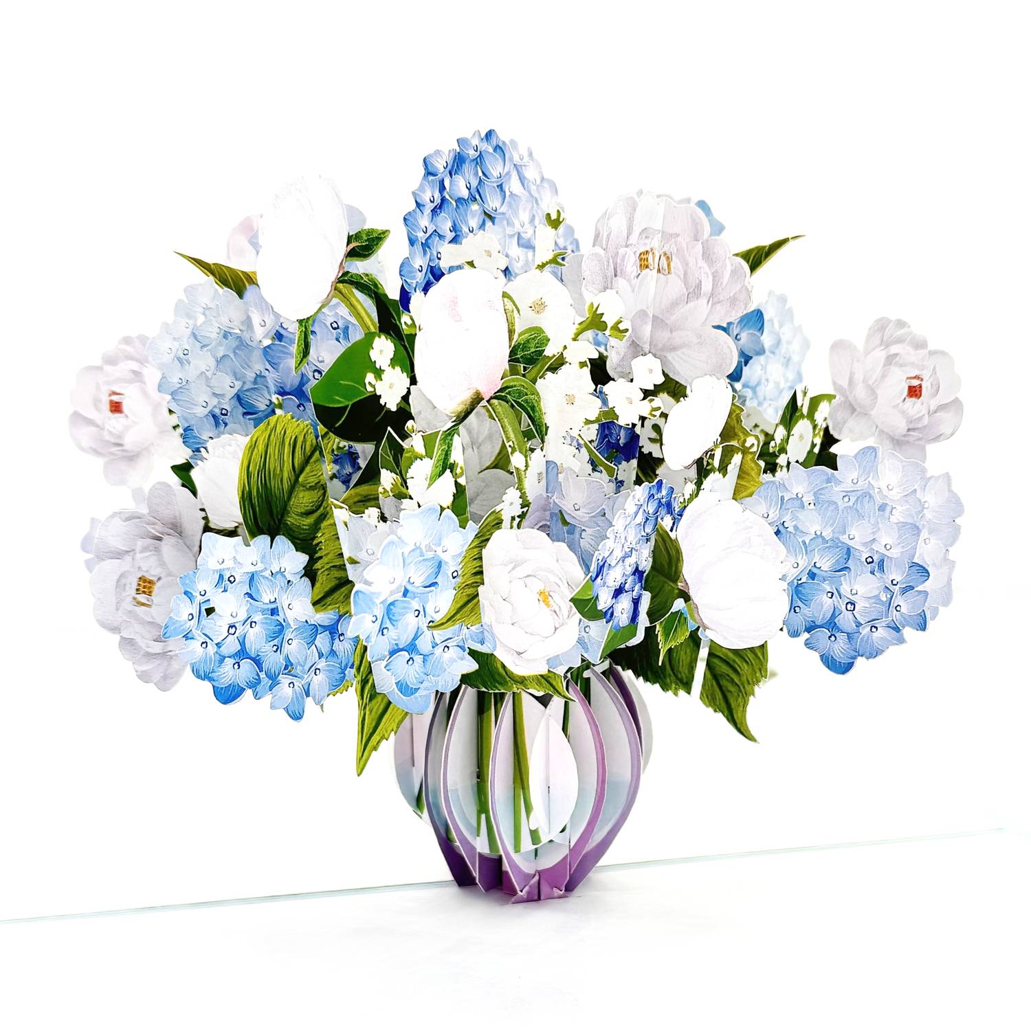 Make a lasting impression with our exquisite Blue Hydrangea Flower Pop Up Card. Crafted to perfection, this stunning card showcases a captivating bouquet of blue hydrangeas and delicate white roses and peonies elegantly arranged in a charming vase.