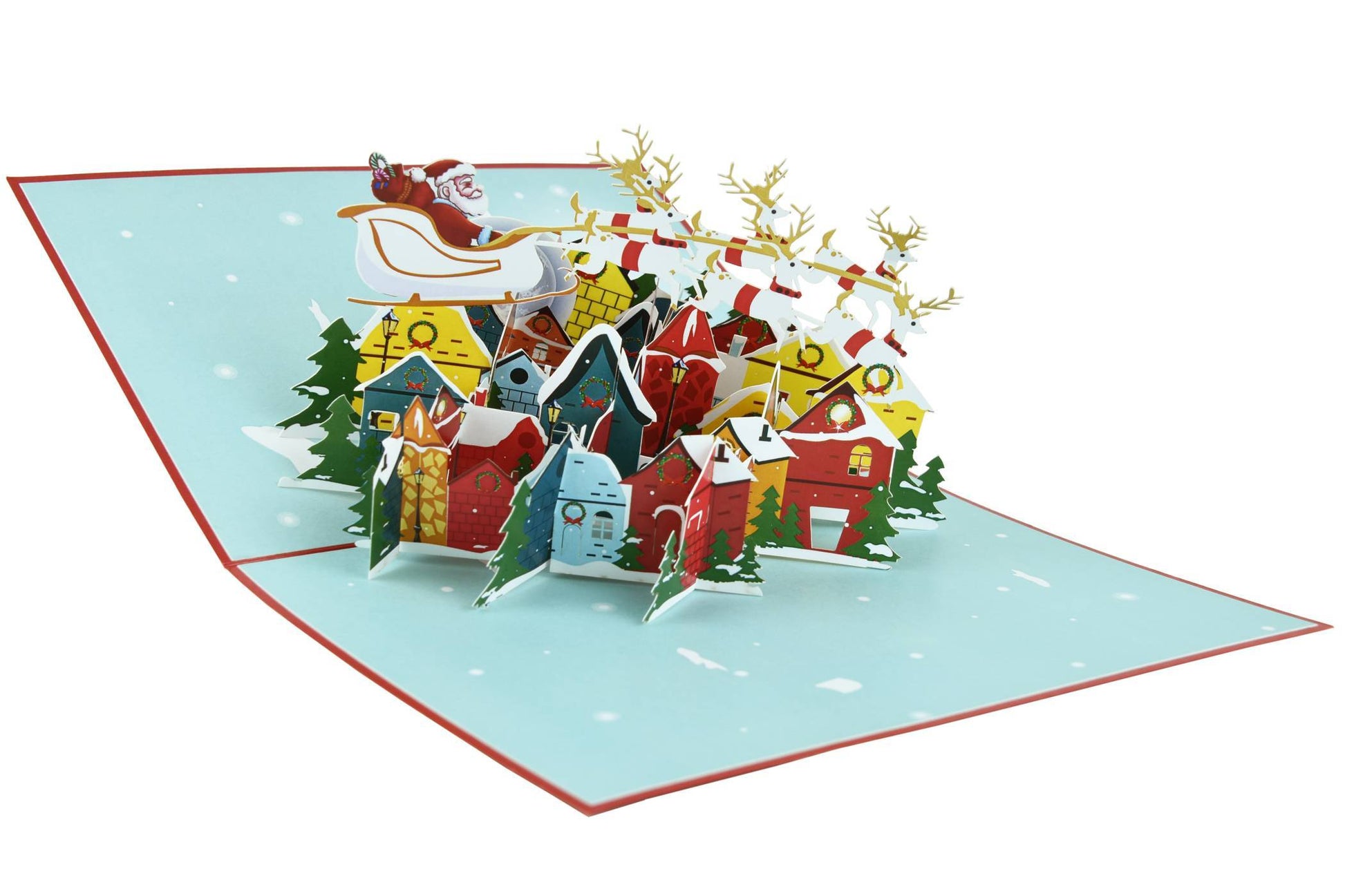 Gently unfurl this artful card, and witness Santa Claus gracefully descending in his reindeer-drawn sleigh, gliding through a snowy night. His gift-filled sack brims with joy, ready to spread cheer far and wide. The intricate details of this handcrafted design mesmerize as they unfold before your eyes.