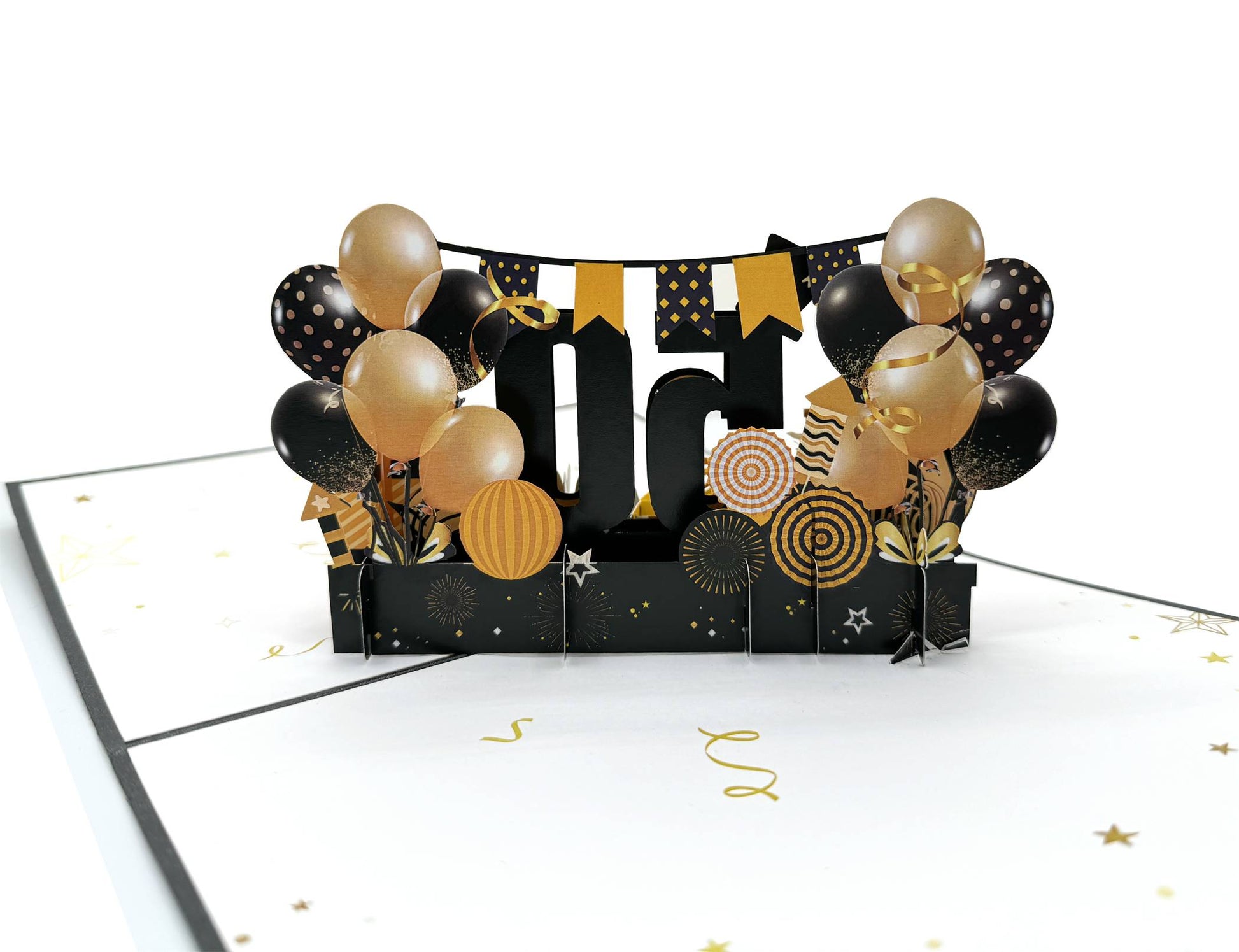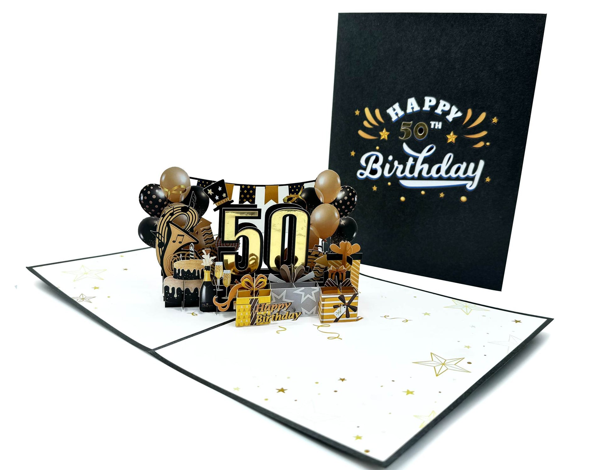 . Perfect for both men and women, this card is designed to bring joy and surprise to the recipient. The intricate design features a vibrant 3D pop-up display with gold and black accents, balloons, gifts, and musical notes, all centered around a large golden "50." This card is sure to make a memorable impression on anyone turning 50.