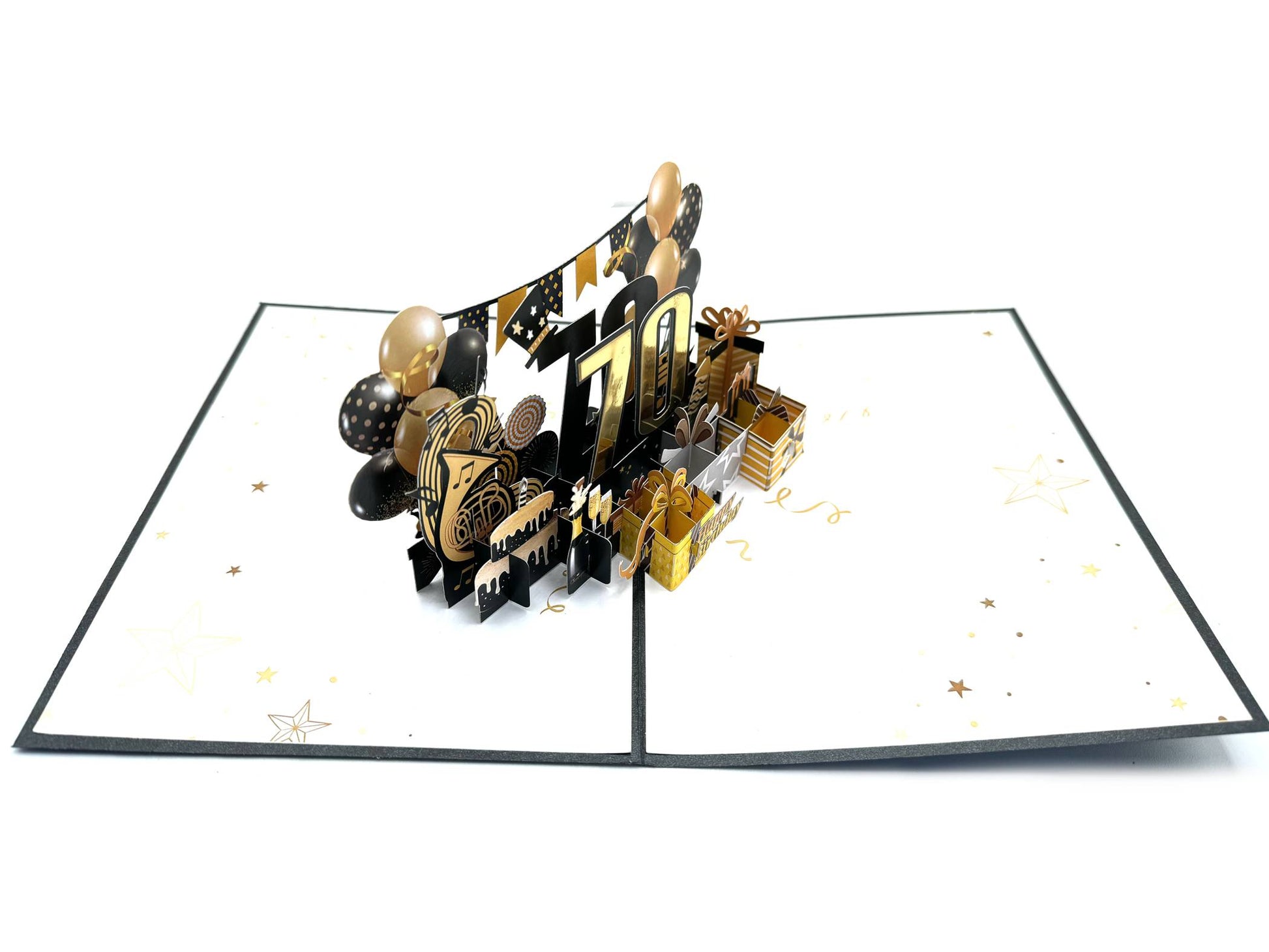 Make the 70th birthday celebration extra special with this exquisite pop-up card that exudes elegance and joy!