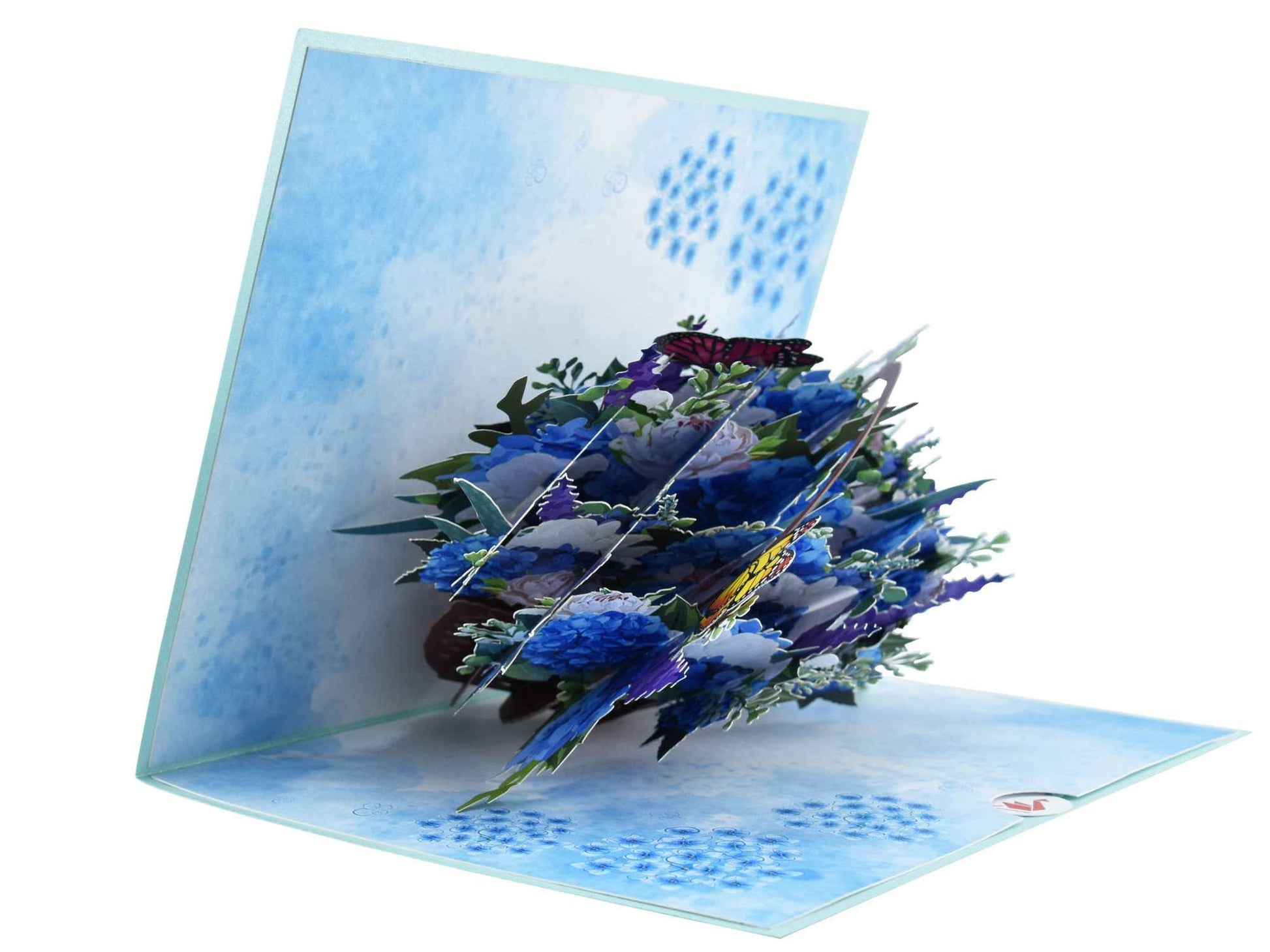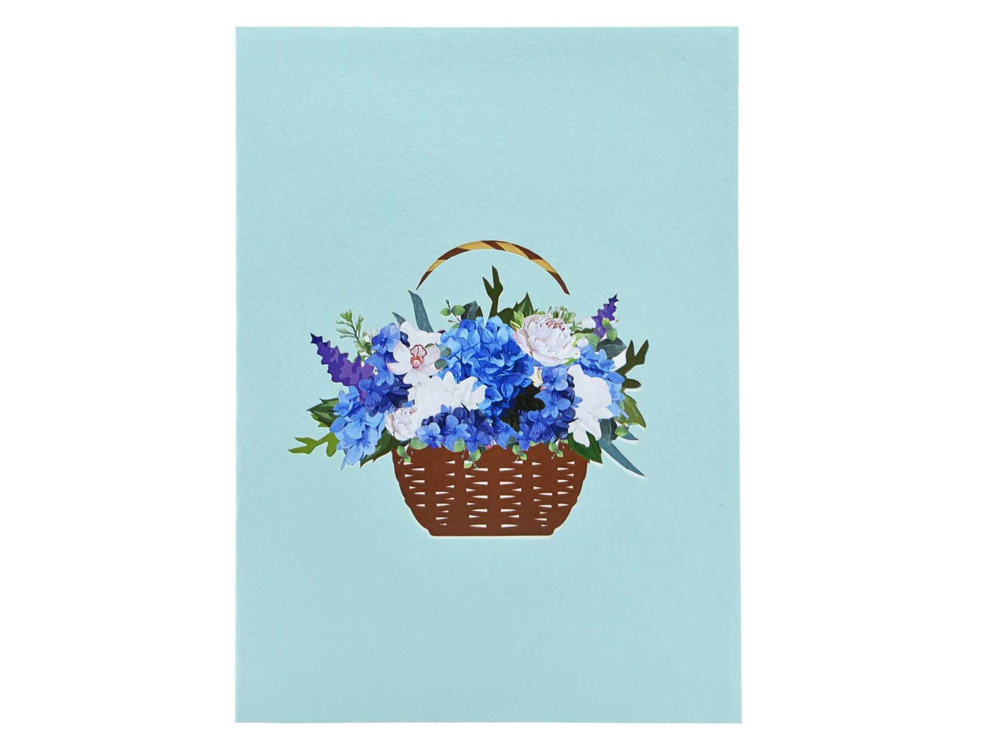 The pop up card features a basket of stunning hydrangea in shades of blue with two butterflies landed on the bouquet.