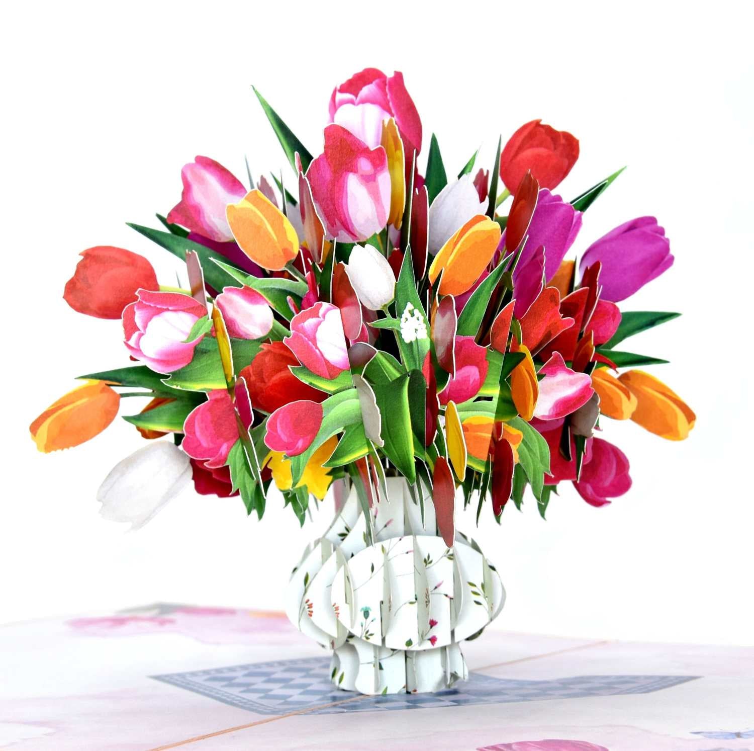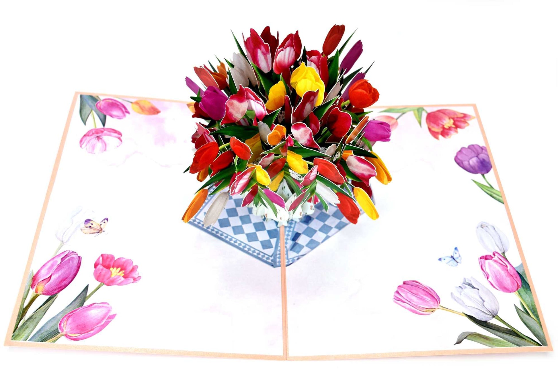 Make a statement with our Tulips Vase Pop Up Card! This beautiful bouquet of tulips in a vintage white vase will instantly bring a smile to the recipient's face. Thoughtfully crafted, this card is perfect for any special occasion to show your love and appreciation. Whether you're searching for something unique to commemorate a milestone birthday, express your adoration on Mother's Day, or recognize the anniversary of your relationship, this pop up card will be sure to make it extra memorable!